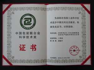 In November, 2016, our M8 series 200-208L drum automatic high-speed production line won the China Packaging Federation Science and Technology Award; due to the outstanding contribution for the industry in China, Mr. Mu Deping, Chairman of our company, won the China Packaging Federation Science Technology Individual Award.
