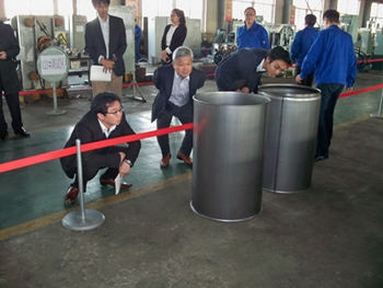 日本鋼桶工業協會(JSDA)的會員,共17家,其中鋼桶專業制造廠家11家,鋼制提桶3家,同時即生產鋼桶又生產鋼制提桶的3家。他們涵蓋了日本鋼桶行業的整個市場。本次交流團是由日本鋼桶行業非常具影響力的11家桶廠組成。目前日本200L鋼桶年產量約達1400萬只,提桶年產量約2000萬只。JSDA的會員公司產量涵蓋了日本鋼桶市場百分之百的份額。 我公司作為中國制桶設備行業龍頭企業以及長期以來堅持不懈的科技創新精神,尤其是近期設計完成的滾壓焊縫機組、及為德國毛瑟提供的高科技全自動生產線等引起了他們的極大關注。
