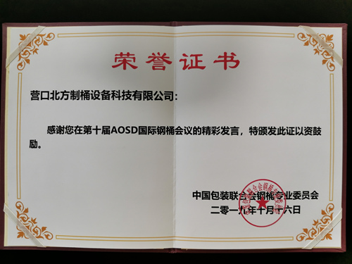 北方制桶設(shè)備發(fā)表的英文主旨演講題目是《高速、智能、環(huán)保制桶生產(chǎn)線的發(fā)展與應(yīng)用》,演講中指出,面對(duì)鋼桶行業(yè)創(chuàng)新、環(huán)保、社會(huì)責(zé)任的新使命,作為一家擁有110年歷史的全套制桶設(shè)備集成供應(yīng)商,我們深知自己的責(zé)任與使命,在產(chǎn)品設(shè)計(jì)之初就融入了節(jié)能環(huán)保的理念,主要研究成果包含以下五個(gè)方面:高速化、自動(dòng)化、集成化、持久化、遠(yuǎn)程化。演講得到了國(guó)內(nèi)外同仁的廣泛關(guān)注及一致好評(píng),并獲得了鋼桶委頒發(fā)的證書(shū)。