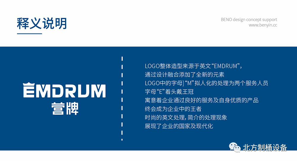 中文名稱“營牌”,logo整體造型來源于品牌的英文名稱“EMDRUM”。通過設計融合添加了全新的元素,字母“M”擬人化的處理為兩個服務人員,字母“E”頭戴王冠,寓意著企業通過良好的服務及自身優質的產品繼續引領行業發展,做國際上具有影響力的全套制桶設備集成供應商!琥珀橙和工業藍的色彩搭配既體現了機械工業科學嚴謹之美又增添了現代工藝的活力。