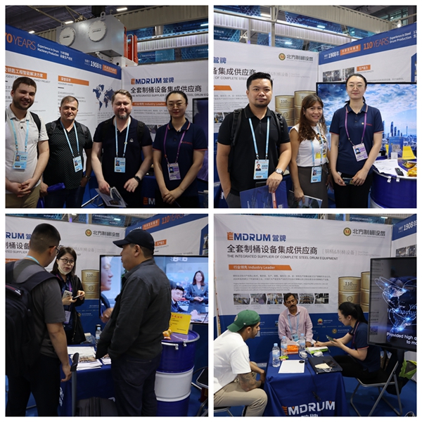 北方制桶在位于D區20.1 F35展位共接待了國內外客人近60余人, 主要來訪客戶來自“一帶一路”共建國家,其中多位客人在展會現場立即與參展員工現場溝通鋼桶生產線的配置細節并有意向到營口北方制桶設備工廠實地考察,詳細討論布局方案等技術細節。